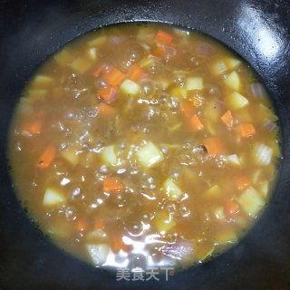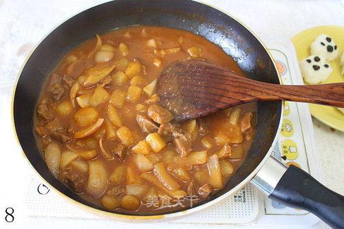 6. 加入咖喱:将咖喱块或者咖喱粉放入锅中,加入适量的水,搅拌均匀。